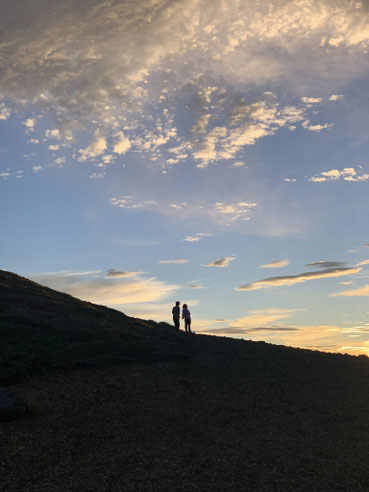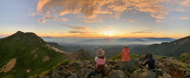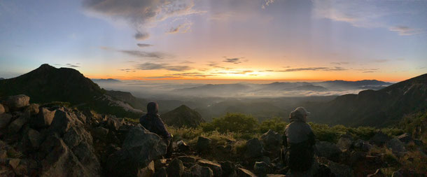 同じ日に根石岳山荘に泊まっていた素敵な「母娘二人の山ガール」朝焼けの仲良しシルエット。
