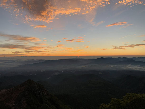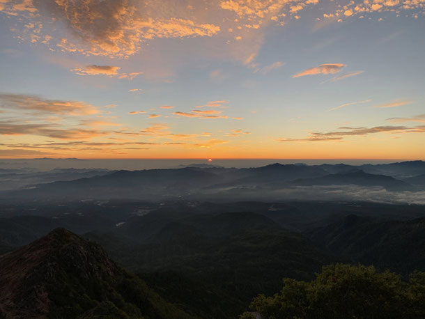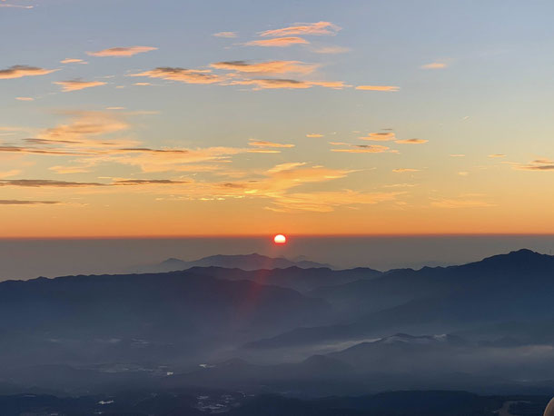 やや雲に霞んで、雲海っぽい景色の中太陽が上がってきます。
