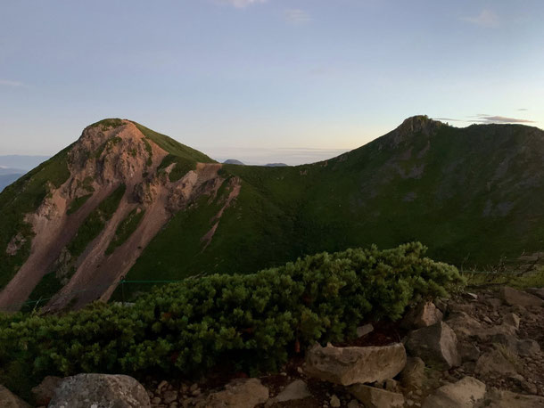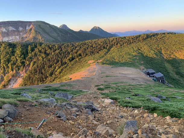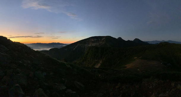 硫黄岳の爆裂火口が朝焼けでに浮かび上がってきます。